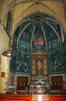 Capçalera poligonal i cúpula al creuer. El parament està tot pintat de blau turquesa i decorat amb estels, representant l'univers.